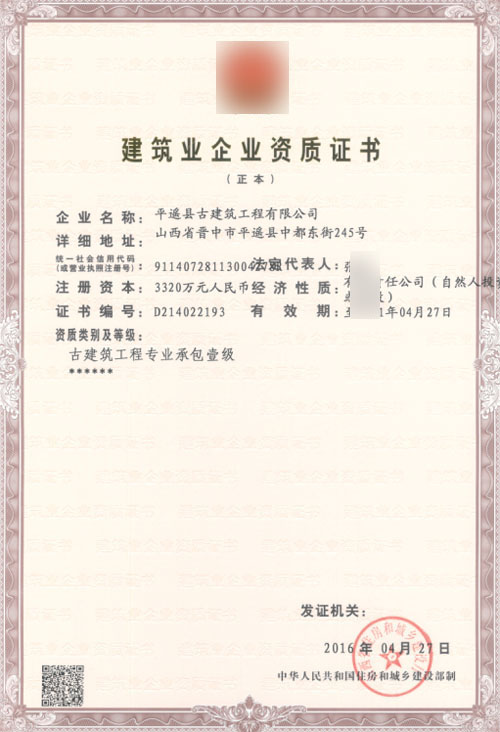 平遙某古建筑公司古建筑工程專業(yè)承包一級資質