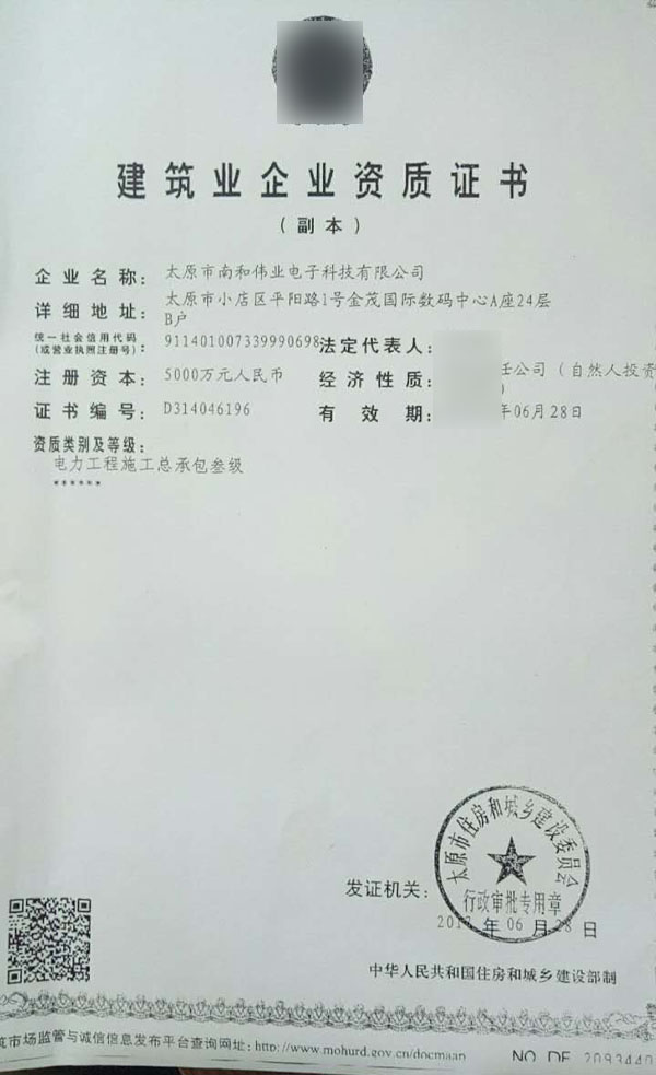 太原某公司電力施工專業(yè)總承包資質