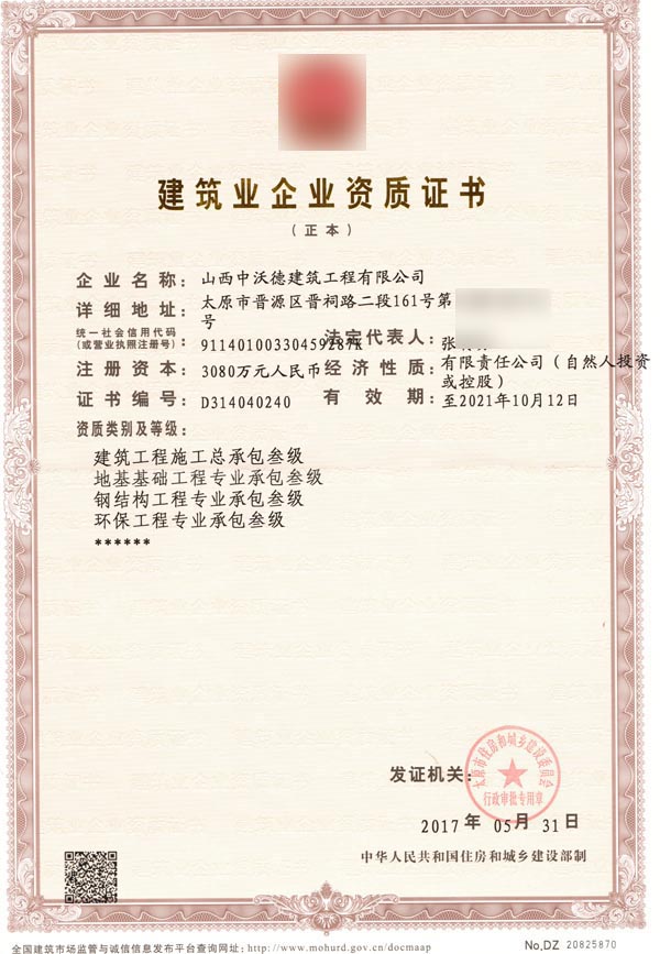 山西某建筑公司建筑業(yè)企業(yè)資質證書